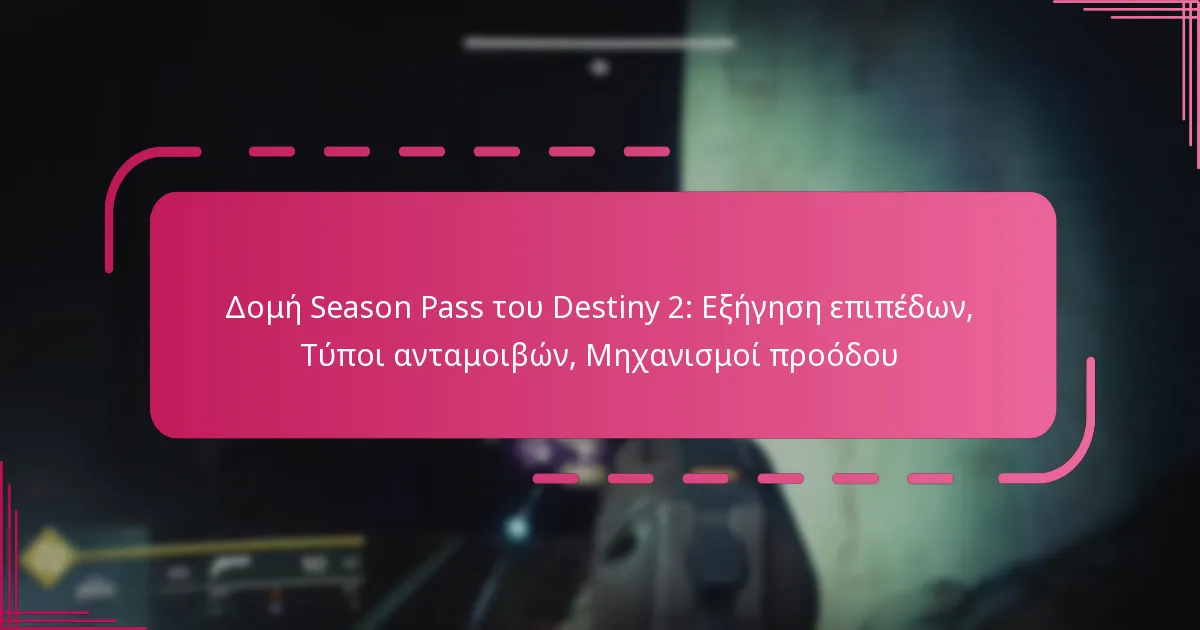 Το Season Pass του Destiny 2 είναι ένα δομημένο σύστημα προόδου που επιτρέπει στους παίκτες να κερδίζουν μια ποικιλία ανταμοιβών καθώς προχωρούν μέσα από τα επίπεδά του. Κάθε σεζόν παρουσιάζει έναν καθορισμένο αριθμό επιπέδων, προσφέροντας τόσο δωρεάν όσο και premium ανταμοιβές που ενισχύουν την εμπειρία παιχνιδιού και προσφέρουν επιλογές προσαρμογής. Οι παίκτες μπορούν να ξεκλειδώσουν αντικείμενα όπως όπλα, πανοπλία, εντός παιχνιδιού νόμισμα και μοναδικά καλλυντικά κερδίζοντας πόντους εμπειρίας (XP), κάνοντάς τους το ταξίδι μέσα από το pass ανταμείβον και ελκυστικό.