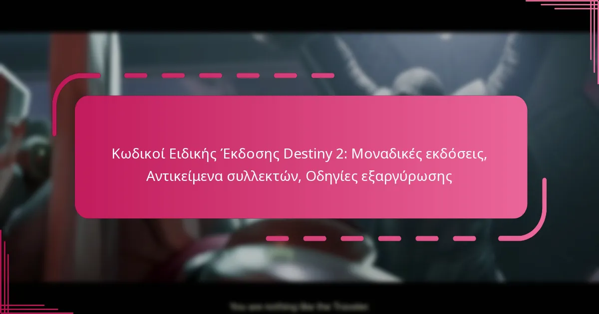 Οι Κωδικοί Ειδικής Έκδοσης του Destiny 2 είναι μοναδικοί κωδικοί που παρέχονται με συγκεκριμένες εκδόσεις του παιχνιδιού και ξεκλειδώνουν αποκλειστικό περιεχόμενο εντός του παιχνιδιού. Αυτοί οι κωδικοί ενισχύουν την εμπειρία παιχνιδιού προσφέροντας αντικείμενα, καλλυντικά και άλλα μπόνους που δεν είναι διαθέσιμα στις τυπικές εκδόσεις.