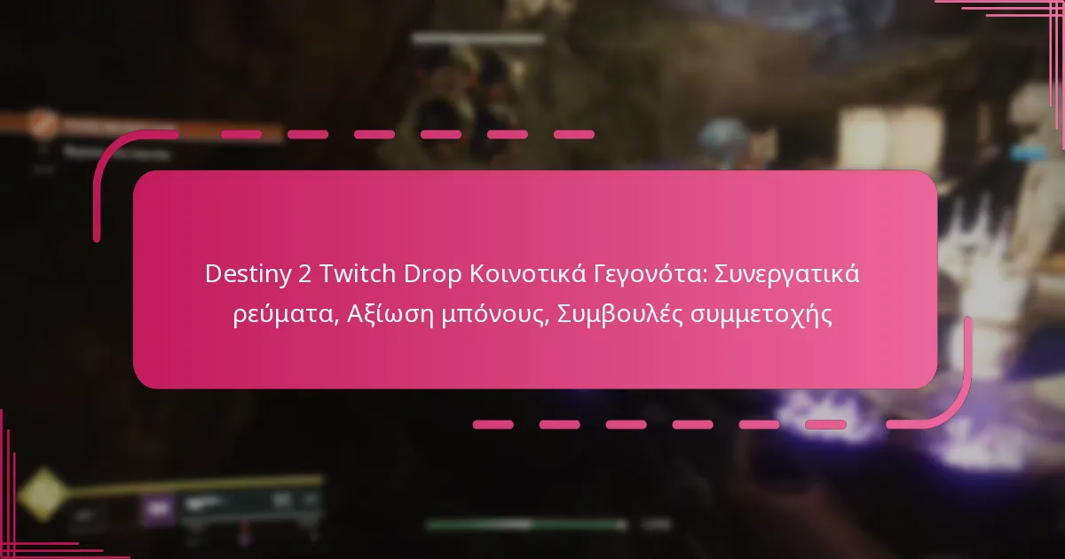 Η συμμετοχή σε κοινοτικές εκδηλώσεις Twitch Drop του Destiny 2 επιτρέπει στους παίκτες να κερδίζουν αποκλειστικά εντός παιχνιδιού βραβεία παρακολουθώντας streams στο Twitch. Για να συμμετάσχετε, πρέπει να ρυθμίσετε τον λογαριασμό σας στο Twitch, να μείνετε ενημερωμένοι για τις επερχόμενες εκδηλώσεις και να συμμετάσχετε στην κοινότητα κατά τη διάρκεια των streams.
